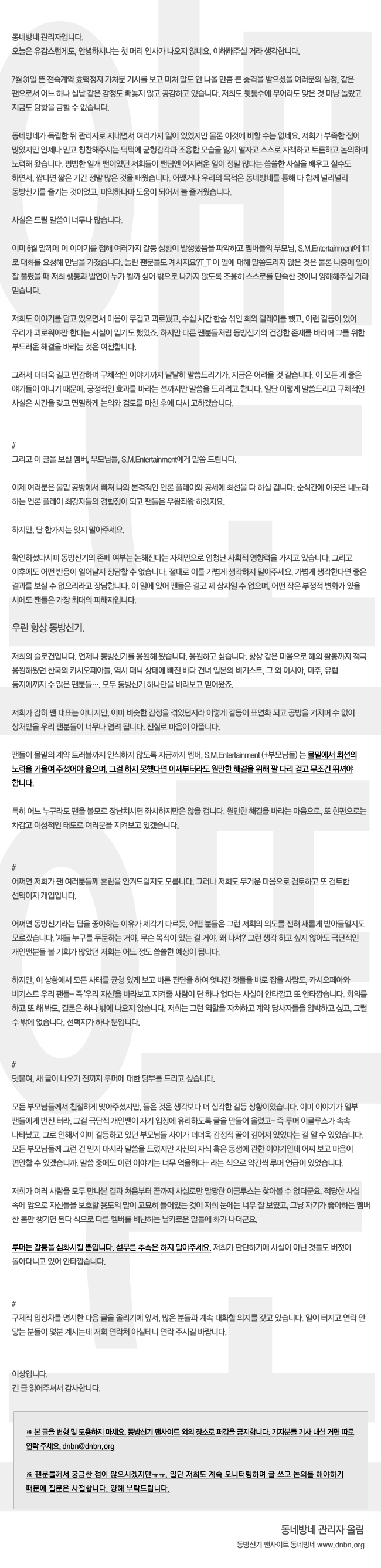 지금도 늦지 않았습니다. 지금도 충분히 가능성은 있다고 생각합니다. 1%의 희망이라도 불가능을 가능하게 만들어낼 수 있으니까요. 동방신기가 처음 일본 진출했을 때, 모두들 불가능하다고 생각했던 조건들 속에서도 지금의 자리에 오를 수 있었던 건 ‘할 수 있다’ 는 희망에 모두의 노력이 더하여진 결과물이라는 걸 잊지 마세요. 우리에게는 아직 희망이 있습니다. 이제 필요한 건 여러분의 노력입니다. =============================== ※ 개인 팬 사이트 마스터분들. 위에서 혹시라도 팀에 폐를 끼치게 될지 몰라서 하는 수없이 침묵하고 있던 소수의 일부 개인팬사이트들까지 dis하는 뉘앙스를 다소 풍긴 탓에 어처구니가 없으시리라 생각됩니다. 팬들에게 일부 개인 팬사이트까지 오해하게 한 그 부분에 대해서는 진심으로 사과 드립니다. 죄송합니다. 하지만 현 상황상 참 그렇습니다. 개인 팬 사이트 마스터분들도 이번