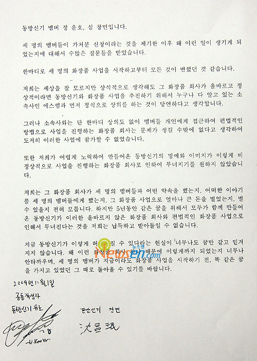 불과 몇 개월 전만 해도 서로 존중하고 존경하였던 회사 관계자와 멤버들. 또한 수 년동안 피나는 노력으로 연습생 시절을 거쳐 데뷔하고 데뷔 후 5년 동안 한 뜻으로 노력하여 한국 일본 등 아시아 최고의 가수로 거듭나서 역사적인 일본 도쿄돔을 연일 매진시키는 공연을 하게 된 동방신기가 왜 지금 이런 위기를 맞이해야 되는지 너무나도 안타까운 심정 뿐이고, 세 명의 멤버가 도대체 왜. 도대체 무슨 이유로 국가적 브랜드로 한류의 정상의 명예와 앞으로 따르는 엄청난 부가가치 및 미래에 대한 보장을 포기하고 이러한 엄청난 분란을 일으키게 되었는지 지금도 저는 마치 꿈만 같습니다.